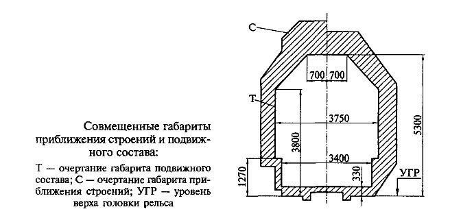 Габаритные расстояния по высоте измеряют от уровня верха головки рельса, горизонтальные расстояния — от оси пути. Очертание I—II—III установлено для перегонов и путей на станциях (в пределах искусственных сооружений), на которых не предусматривается стоянка подвижного состава, очертание Iа—IIа—IIIа—IVa — для остальных путей станций. Высота габарита указана на рисунке дробью: числитель — для контактной подвески с несущим тросом, знаменатель — без него. Ширина габарита приближения строений С составляет 4900 мм. В габарите для перегонов на расстоянии от оси пути 1745 мм предусмотрен скос высотой 1070 мм от уровня верха головки рельса для перил на мостах, эстакадах и других искусственных сооружениях. Расстояние от оси пути до линии приближения строений (вновь строящиеся здания, заборы, опоры контактной сети и линий связи) составляет 3100 мм. Государственным стандартом установлен также габарит Сп, отличающийся от габарита С отдельными размерами (например, высота для габарита Сп равна 5500 мм). Требованиям этого габарита должны удовлетворять сооружения и устройства депо, мастерских, грузовых районов, складов, портов, промышленных предприятий, а также между территориями этих предприятий, т. е. там, где скорости движения сравнительно невысоки